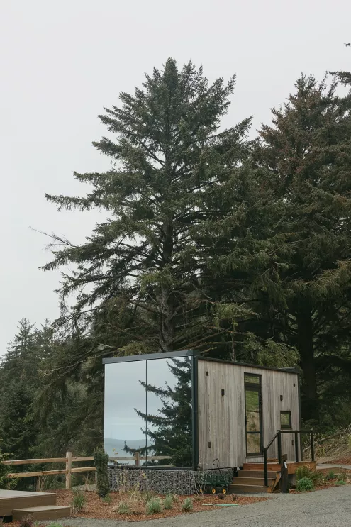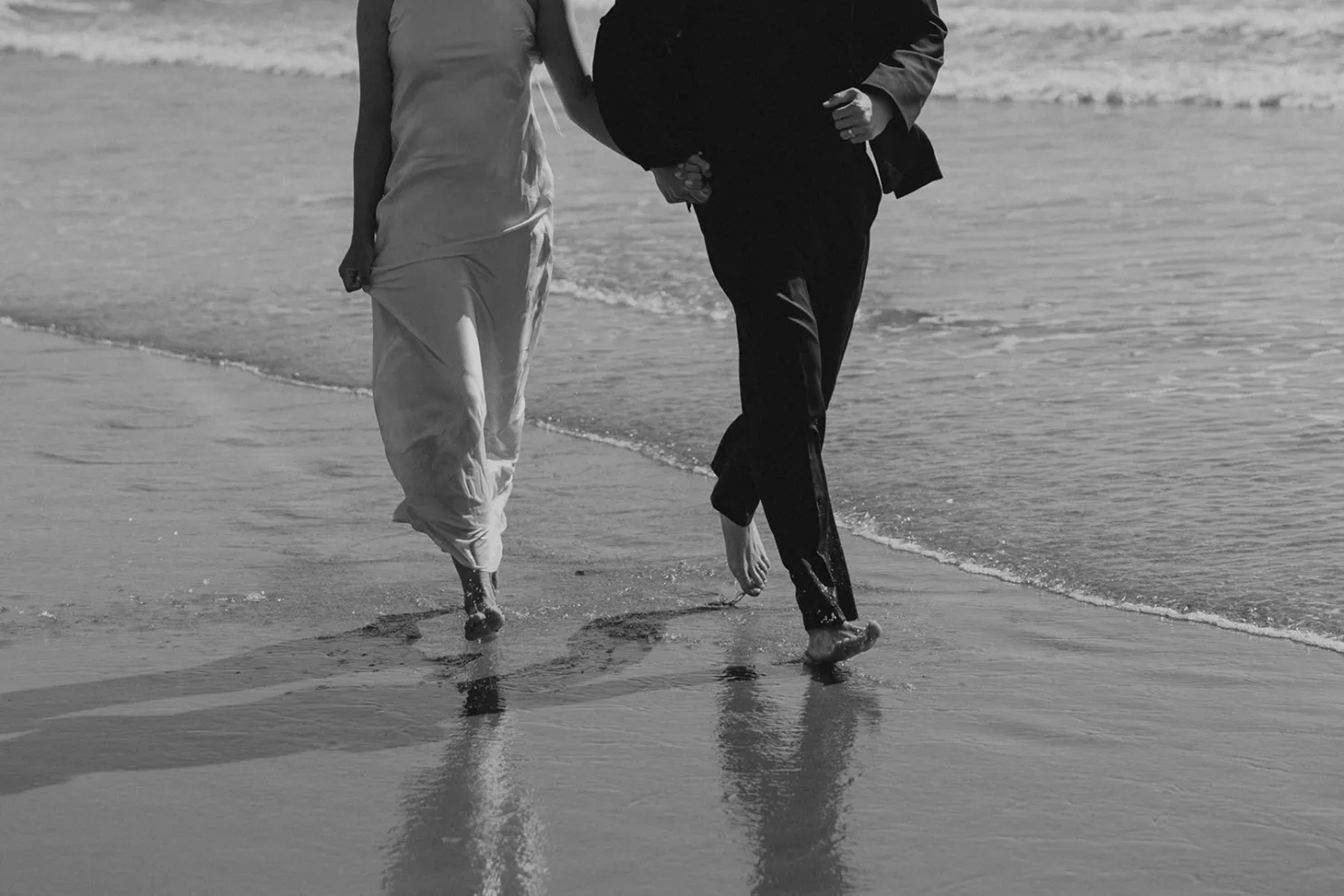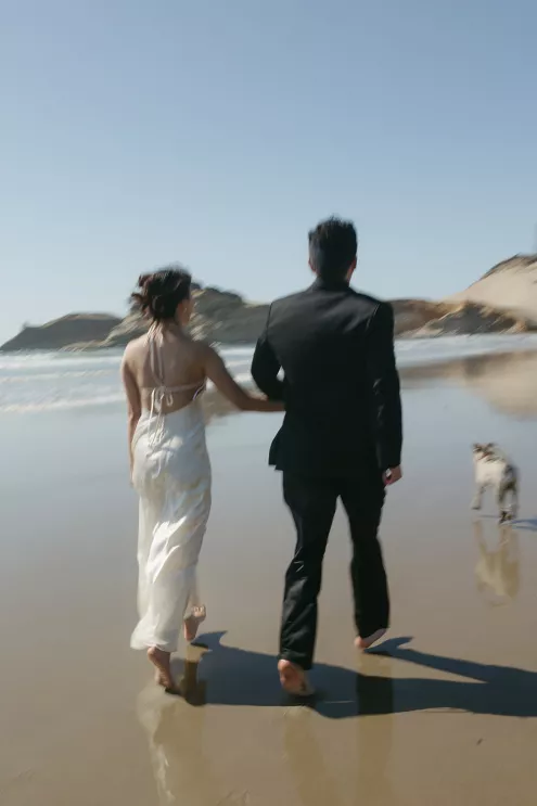 The day began at Two Capes Lookout, where the real-life married models shared a quiet morning inside the property’s mirrored domes before their first look. The clean geometry of the space and the muted coastal light created a tranquil start to the day before the scene shifted to the sand.