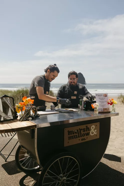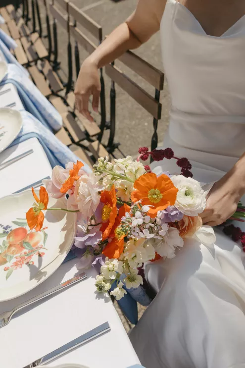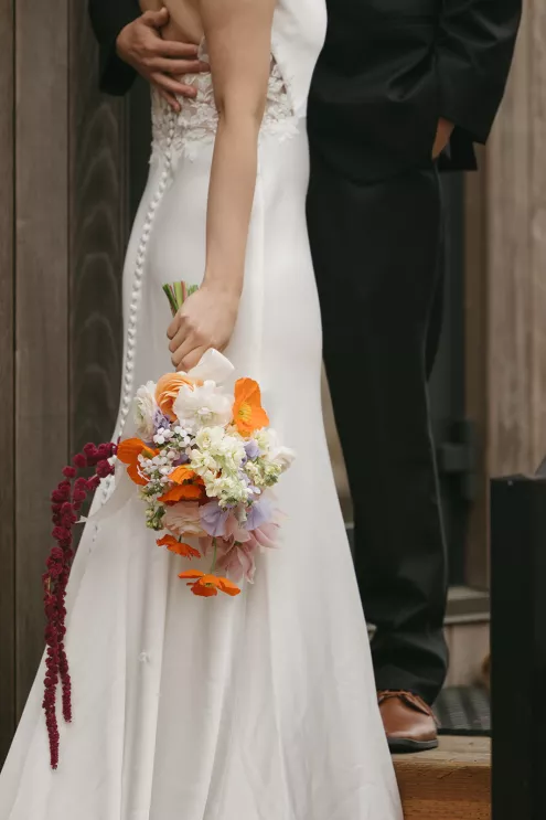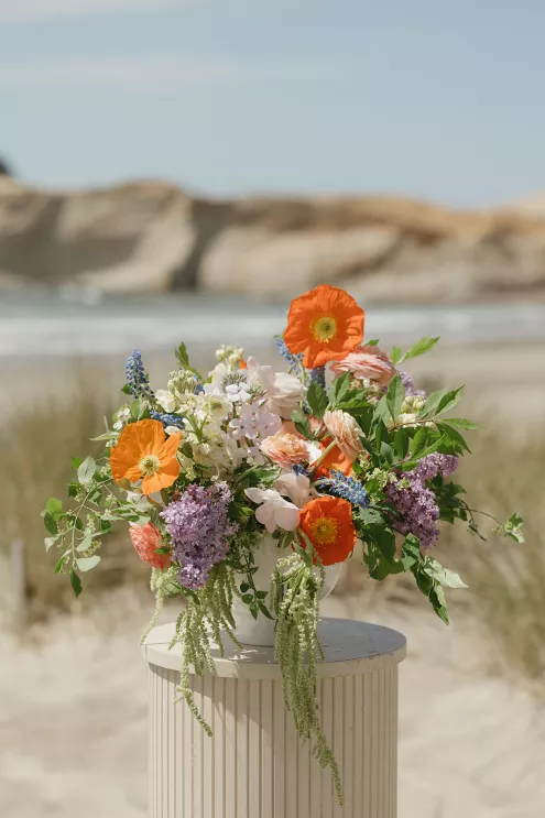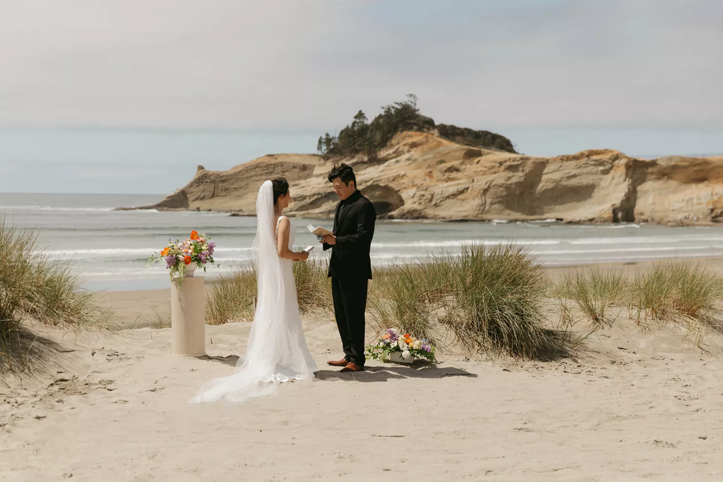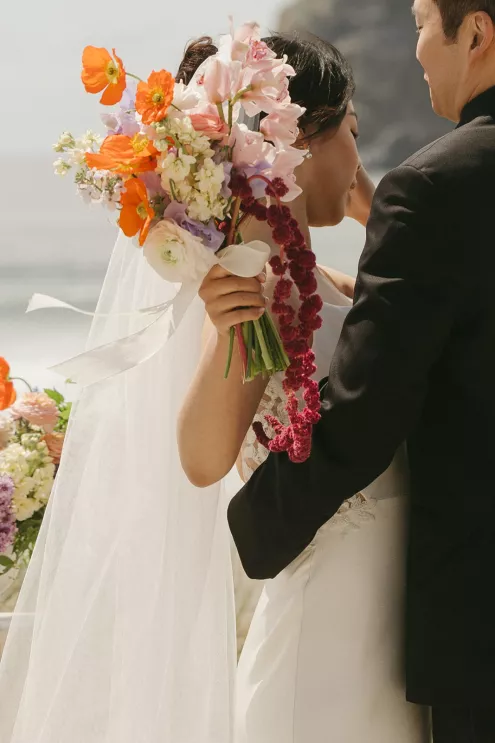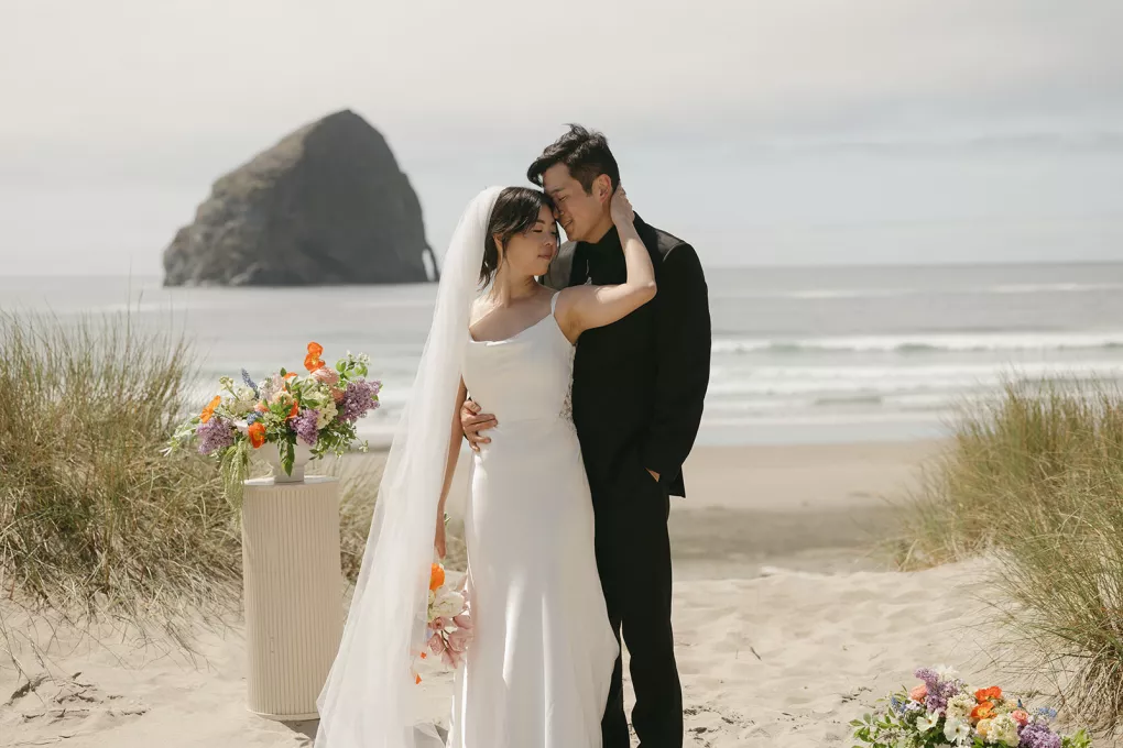 On the beach, an intimate ceremony framed by dune grass and minimally flowered pillars overlooked Haystack Rock. The arrangements were light and organic in shape, featuring ranunculus, poppies, lilac, hyacinth and amaranthus in a palette of soft whites, peaches and vivid oranges. The bride’s veil lifted in the breeze, her sleek A-line gown with lace detailing standing out against the backdrop of sand and sea.