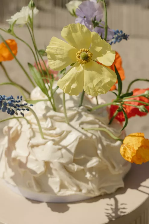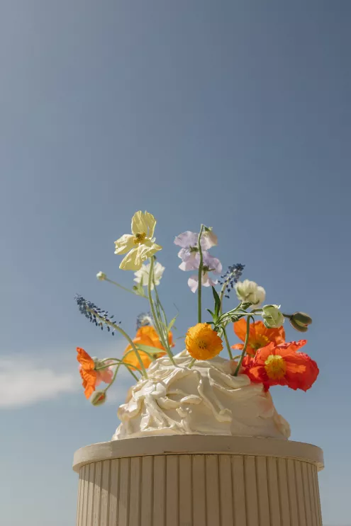 Unique touches added character throughout the afternoon: hand-painted watercolor portraits offered attendees a fashionable keepsake, and a s’mores cart served playful desserts oceanside. A dome-shaped cutting cake with free-form texture bursting with single-stem blooms carried the same whimsical energy that tied the design together.