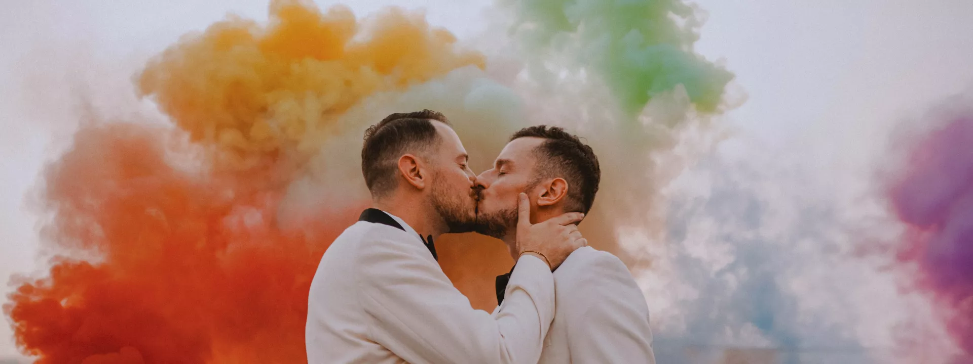 Amid all the uncertainty of the COVID-19 pandemic, Michael Coon and Kurtis Owen found something to rely on: each other. The couple met online and quickly bonded over movie nights, shared laughter and wine tasting. Abbey Road Farm’s winery was the perfect venue—as an architect, Michael adored the elegant design with exposed wood trusses. The couple embraced minimalism in their décor, letting the space’s natural beauty speak for itself. Every unique touch was intentional and expressed Michael and Kurtis’ bold personalities, like the three disco ball chandeliers accented with bright flowers that hung above the reception. Every floral arrangement from Botanica Floral Design featured a bed of dried flowers and pampas grass as a neutral base color palette, with bursts of brighter hues woven in. The sun-drenched outdoor ceremony featured stunning views of the surrounding fields and rolling hills. A set of rainbow smoke cans created an exciting moment, with the release of colorful clouds making for a beautiful photo opportunity. The celebration moved indoors for dinner and dancing, where an array of personal touches added to the warm atmosphere, including napkins featuring the couple’s treasured dogs, Beau and David. Several neon signs included some of their favorite phrases, and rainbows incorporated in the florals celebrated Michael and Kurtis’ authenticity and identity. The dreamy night could not have better represented the couple’s bold and unapologetically fun personalities.