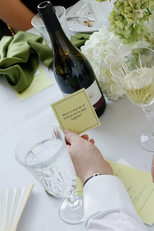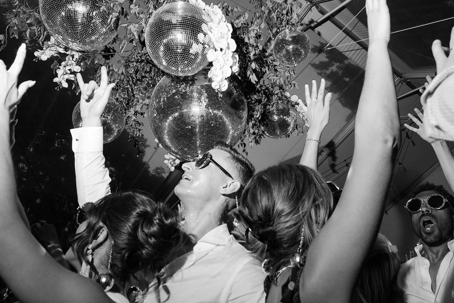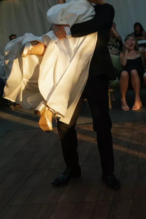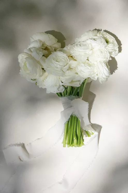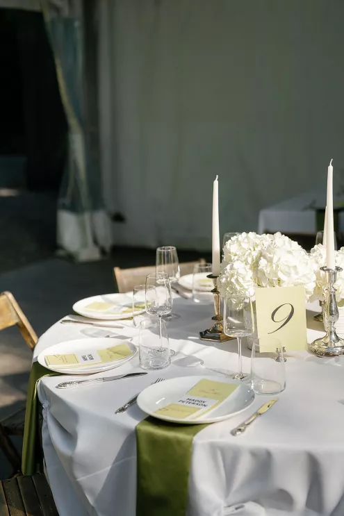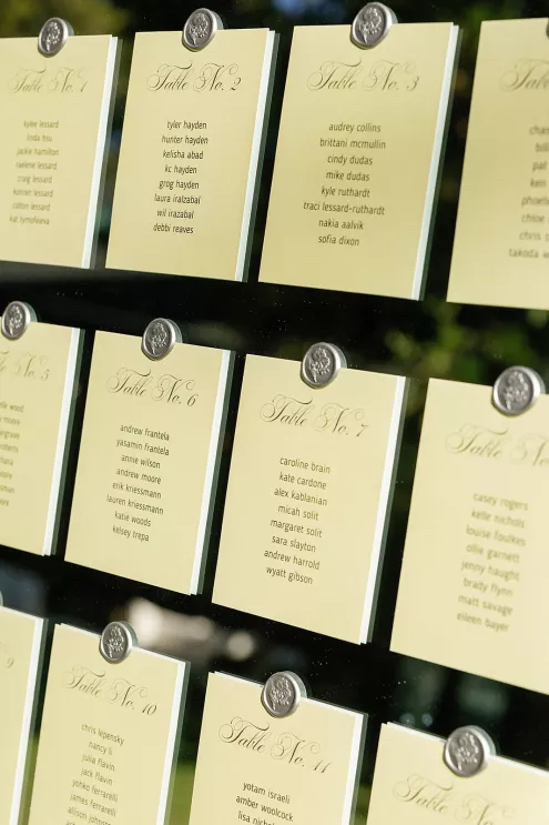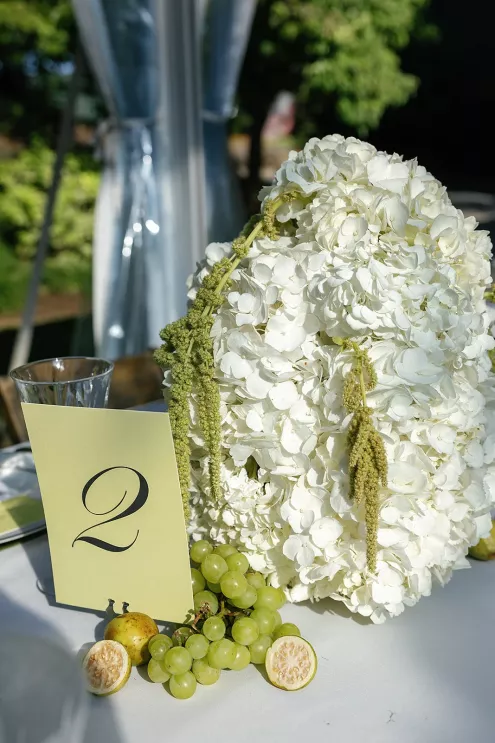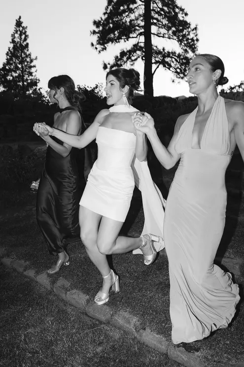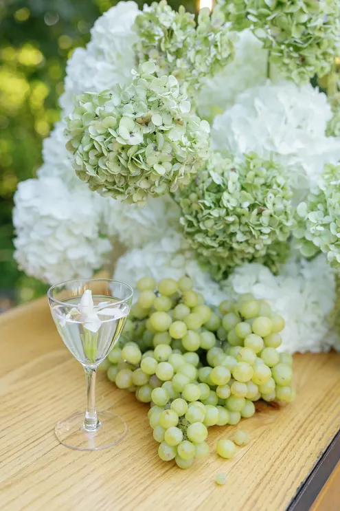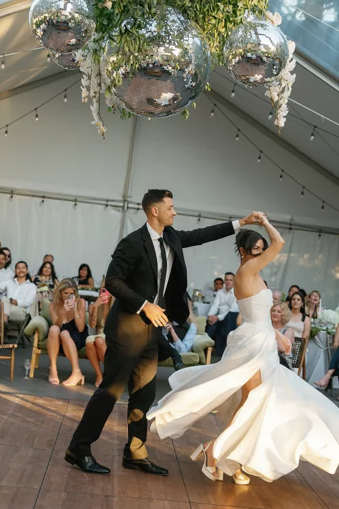 On a sunny late-summer day, Kylee and Tyler infused their favorite pastime—bringing their loved ones together—with a grand and elegant flourish. The scenic views of The Griffin House were even more striking as warm rays of light created a dreamy backdrop for the happy couple’s outdoor ceremony. Kylee stunned the crowd (all with parasols in hand) as she floated down the aisle in her simple, strapless gown, carrying a bouquet of white roses. Framed by modern podiums topped with lush, monochromatic floral arrangements of hanging anthurium and hydrangeas, the pair exchanged vows, becoming husband and wife in a picture-perfect setting. At the reception, tablescapes featured vibrant shades of green against crisp white linens, with luscious figs, juicy grapes and bright citrus lending an unexpected flair. Guests were prompted with conversation cards to encourage connections, while tapered candles flickered and reflected against the large disco ball installation suspended overhead—a spirited hint of the party to come. Kylee then slipped into a party-ready and ultra-trendy mini dress with a matching scarf before stepping out onto the dance floor. And don’t forget the swag: Guests donned oversized sunglasses and disco ball necklaces to celebrate Kylee and Tyler in style.