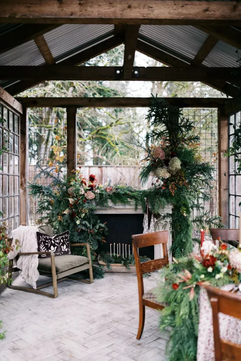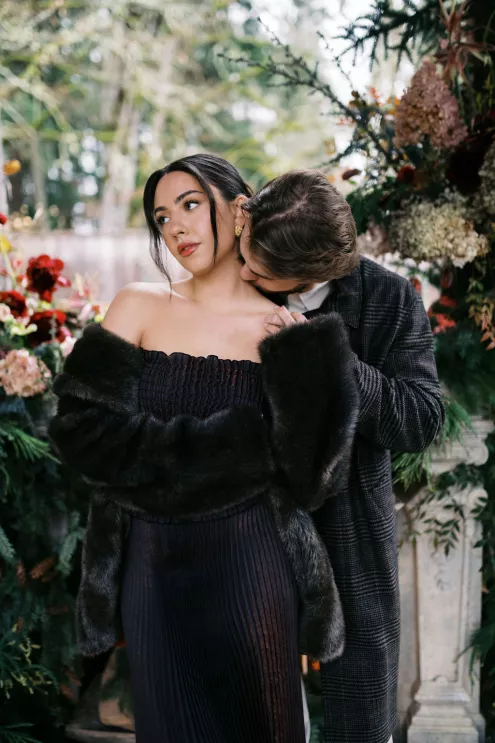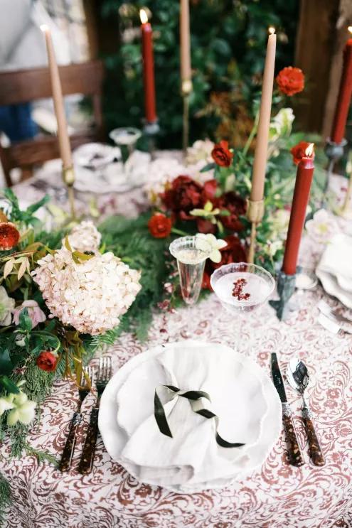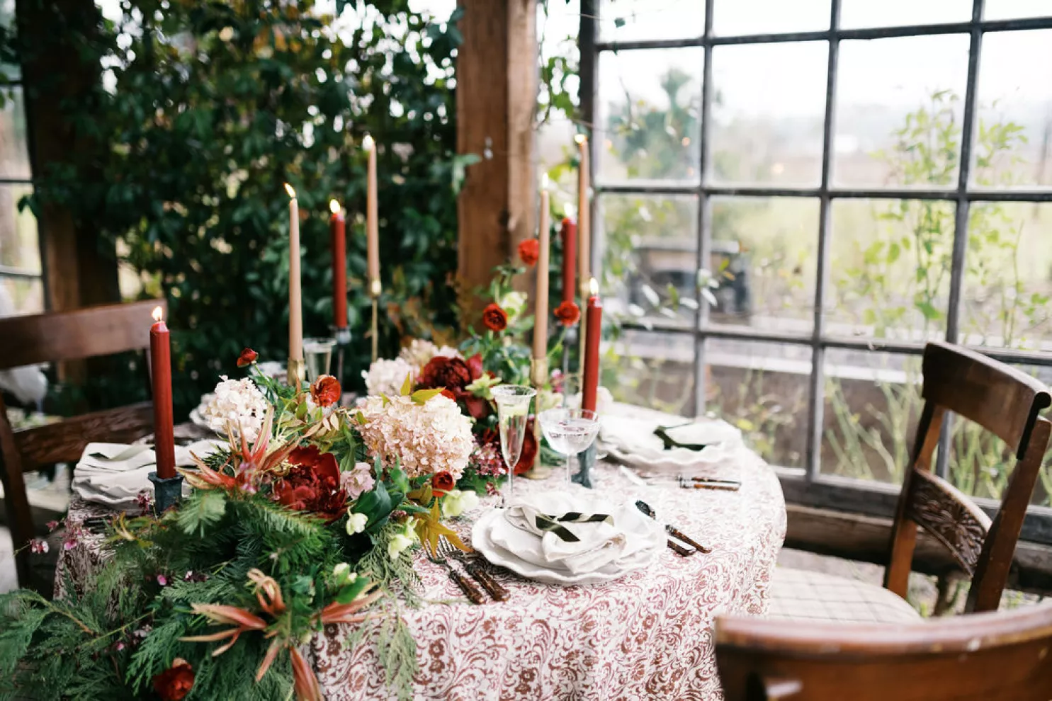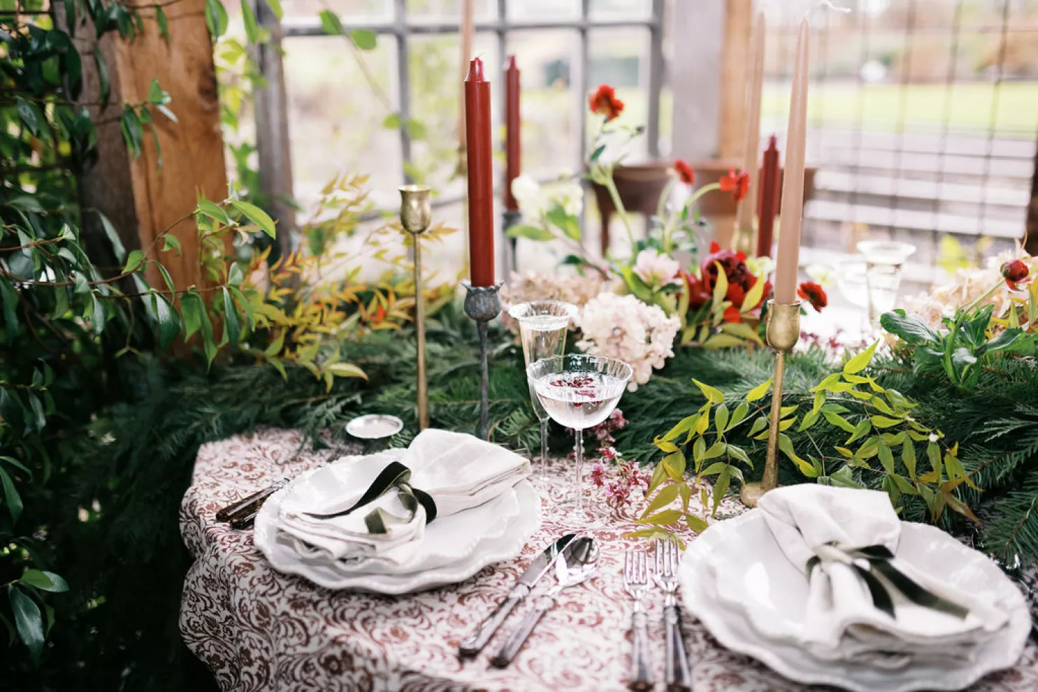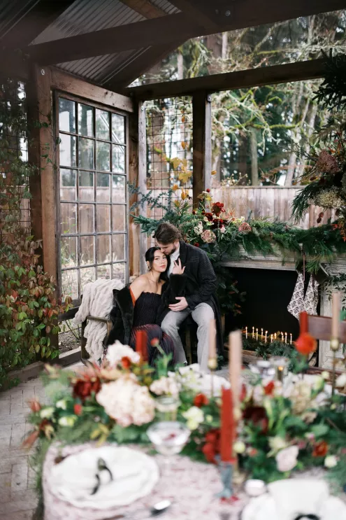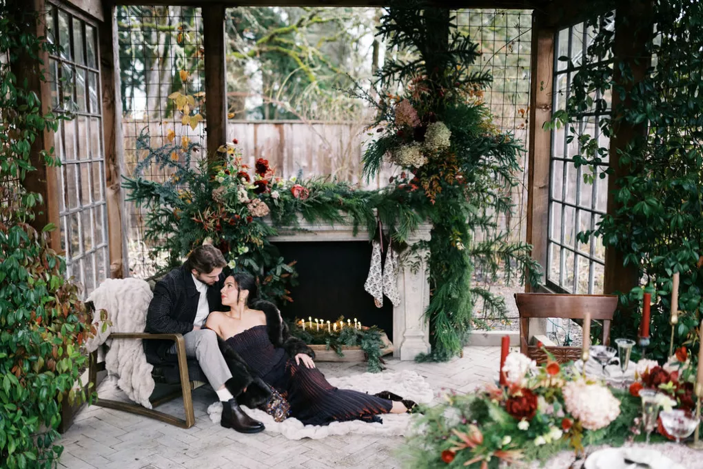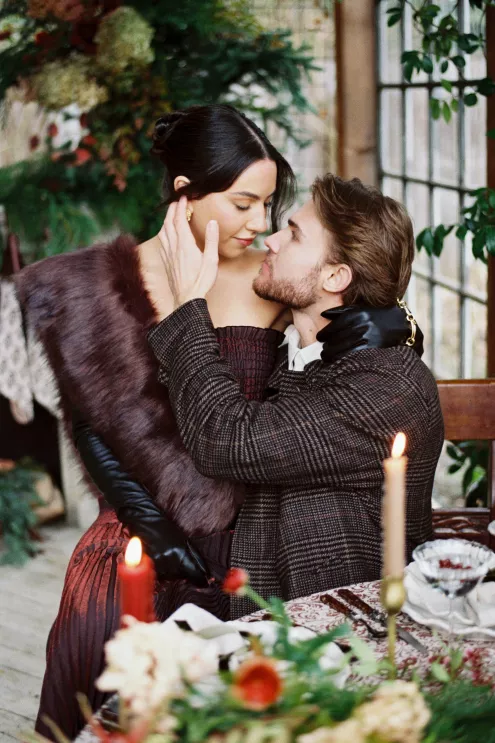 Bringing together the old-world elegance of Europe and the rustic, organic charm of winter, Kara Cederberg, owner of KC Experiential House, and a team of top-notch vendors crafted a design that expertly reflected the romance and warmth of the festive season. On a cloudy December day, soft natural light beamed through the glass walls of Seventh Stem’s private greenhouse and onto arrangements of forest green, burgundy and blush hues, woven together to create a seamless table runner that waterfalled onto the floor. Vintage dishware and mismatched candlestick holders made the space feel cozy and lived in, a stunning contrast to the delicate and sophisticated glassware. The intimate table design featured a gorgeous white and burgundy tablecloth and complementing pomegranates—symbolic of life, prosperity and good fortune in many cultures. Embracing the cold weather in fur and wool ensembles, the real-life couple epitomized timeless glamour. Overall, the aesthetic embodied Cederberg’s vision of “cultivated beauty and effortless refinement, where the holiday romance unfolds through lush greenery, candlelit gatherings and heirloom details.”