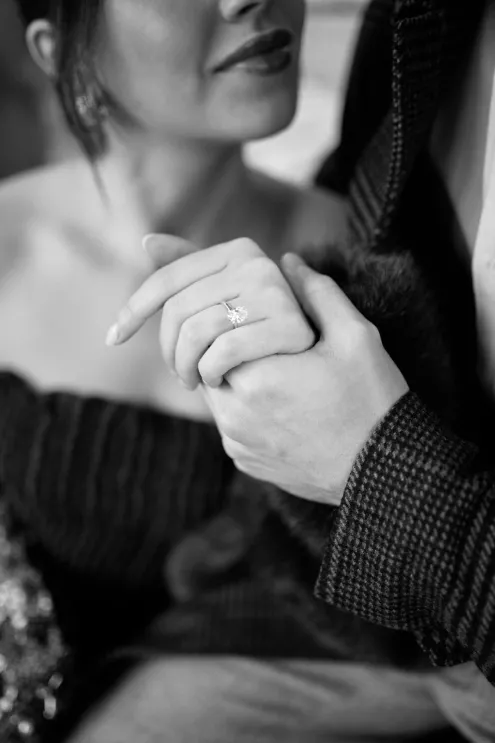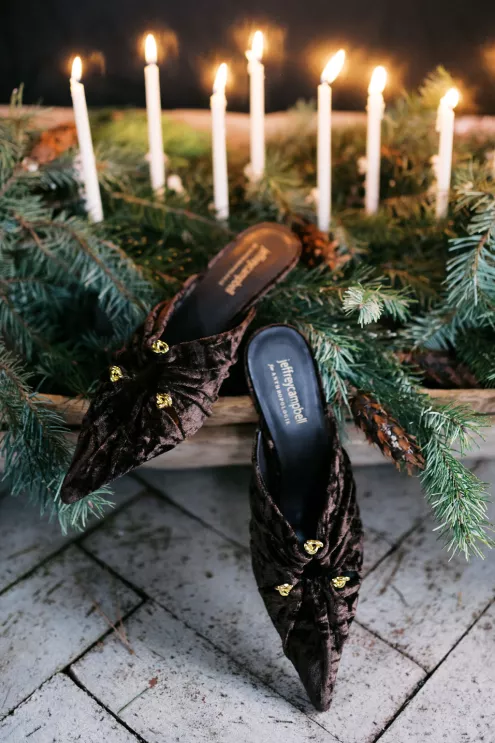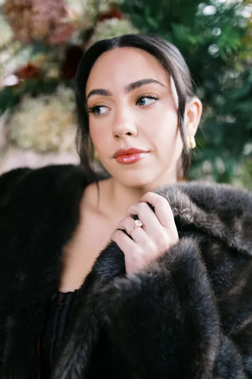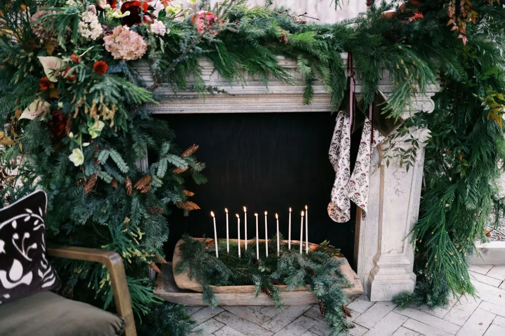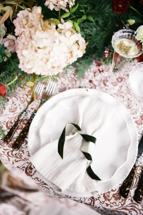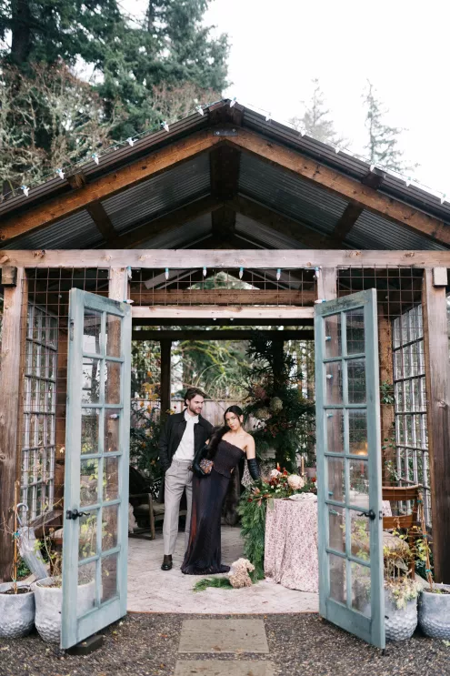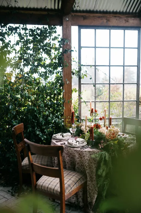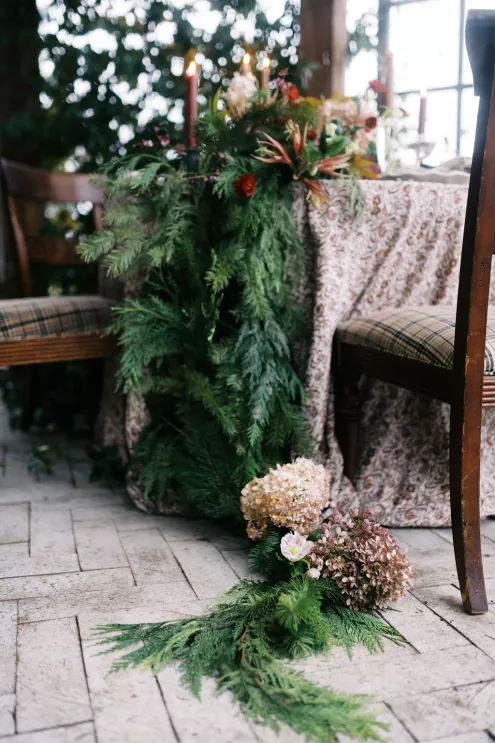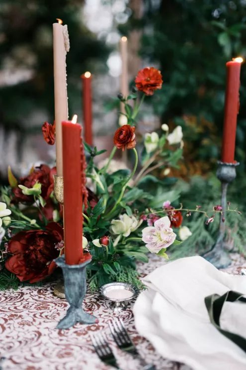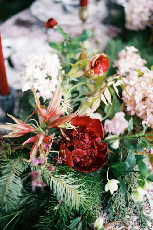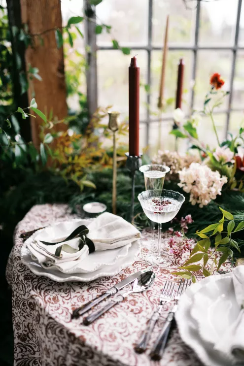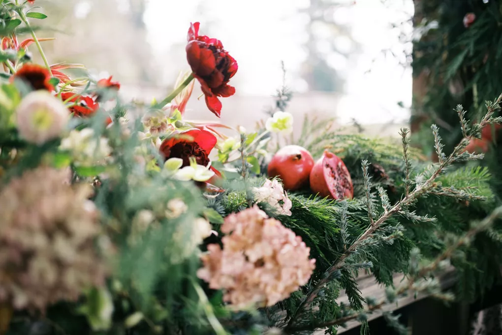 Bringing together the old-world elegance of Europe and the rustic, organic charm of winter, Kara Cederberg, owner of KC Experiential House, and a team of top-notch vendors crafted a design that expertly reflected the romance and warmth of the festive season. On a cloudy December day, soft natural light beamed through the glass walls of Seventh Stem’s private greenhouse and onto arrangements of forest green, burgundy and blush hues, woven together to create a seamless table runner that waterfalled onto the floor. Vintage dishware and mismatched candlestick holders made the space feel cozy and lived in, a stunning contrast to the delicate and sophisticated glassware. The intimate table design featured a gorgeous white and burgundy tablecloth and complementing pomegranates—symbolic of life, prosperity and good fortune in many cultures. Embracing the cold weather in fur and wool ensembles, the real-life couple epitomized timeless glamour. Overall, the aesthetic embodied Cederberg’s vision of “cultivated beauty and effortless refinement, where the holiday romance unfolds through lush greenery, candlelit gatherings and heirloom details.”