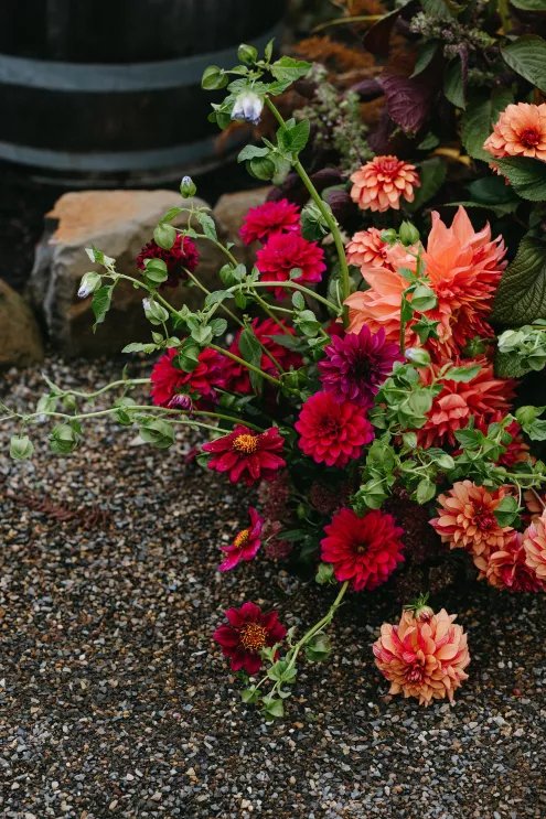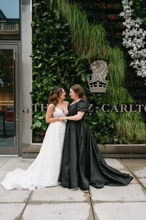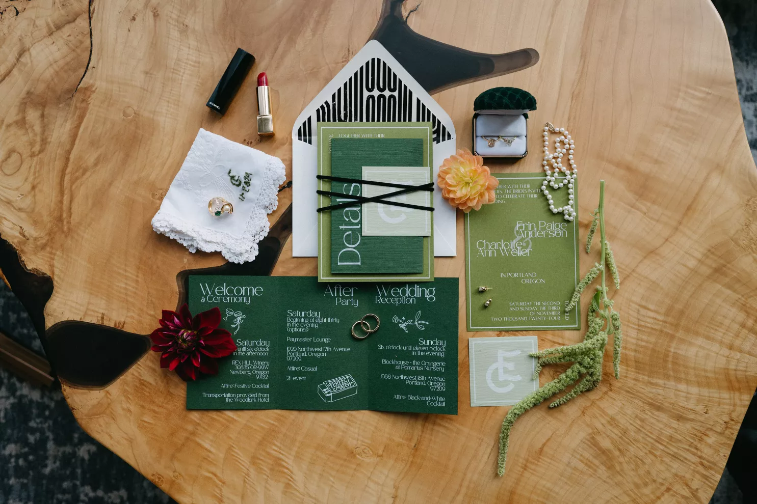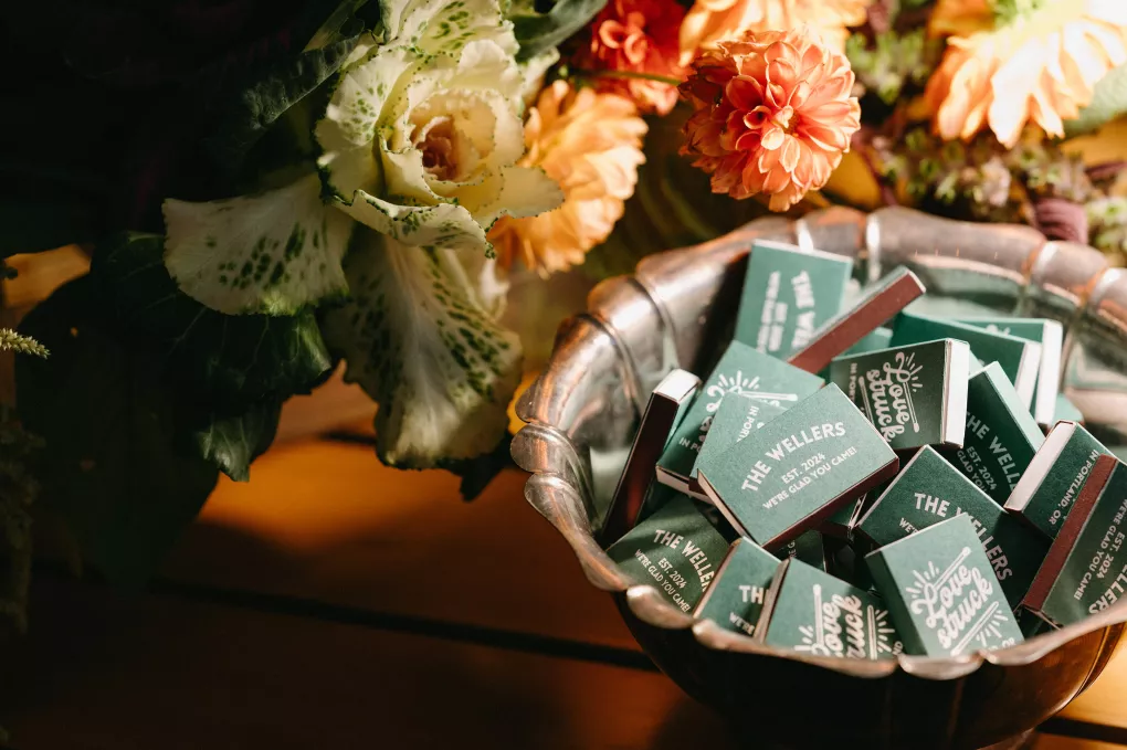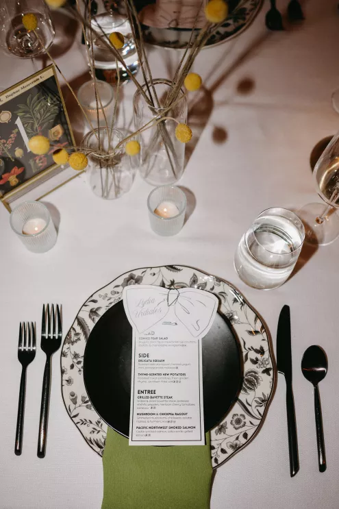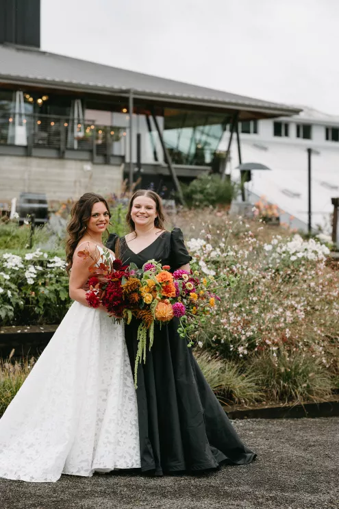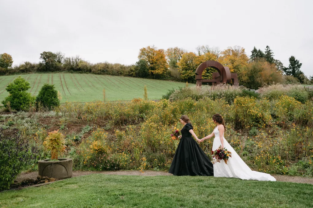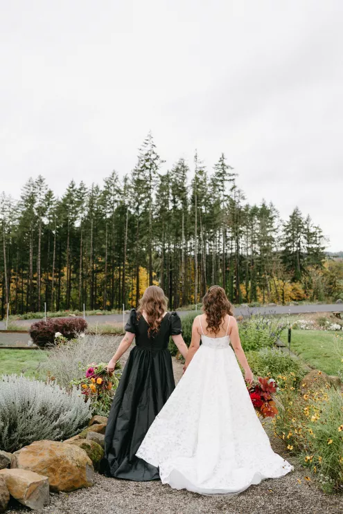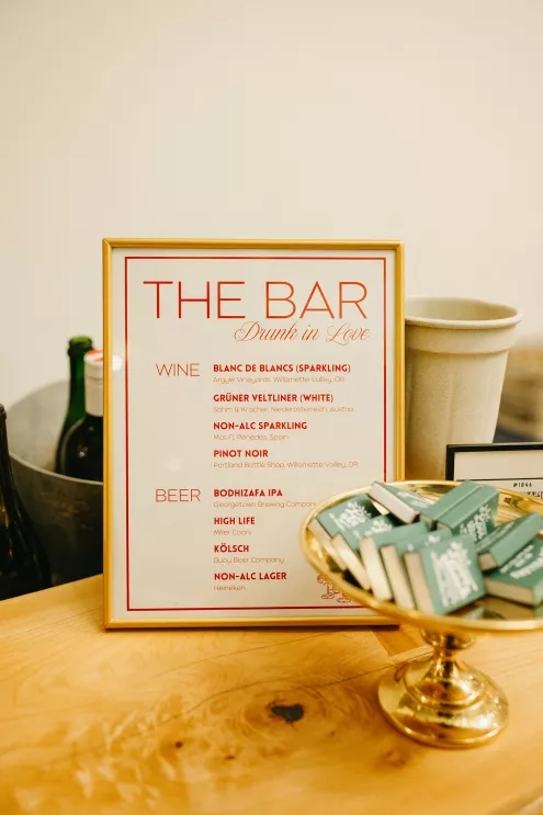 Erin Anderson and Charlotte Weller’s wedding weekend perfectly reflected the duality of the couple’s interests with a warm, intimate ceremony followed by a lively dinner and dance party. The happy couple wanted to honor both their love for the outdoors and their passion for exploring city life with a two-day excursion, each day inspired by their complementary hobbies. Under an overcast sky, Charlotte and Erin’s vision for a cozy ceremony came to life on the verdant grounds of Rex Hill Winery. Erin and Charlotte opted for unique textures and color combinations when it came to their floral arrangements. Romantic blooming dahlias, roses and zinnias were paired with playful ornamental kale, amaranth and smoke bush in color-blocked hues of burgundy, bright pink and creamsicle orange. Charlotte’s black satin puff-sleeved gown contrasted beautifully against Erin’s whimsical floral lace, a visual representation of their dynamic personalities. Their tear-jerking ceremony, framed by moody florals, was followed by a simple cocktail hour, during which guests reveled in the newlyweds’ love. The following day, elegant signage stated, “Join us at the Love Club,” inviting Charlotte and Erin’s loved ones for an evening of dinner, drinks and dancing. Soft shades of sage served as an accent, gracing the tablescape and custom matchboxes. Embroidered hats, heart-shaped sunnies and light-up foam sticks were offered as accessories for the dance floor. After a lively dinner and dancing, Erin and Charlotte gifted their guests with custom cookies showcasing their beloved pet as a sweet ending to their day.