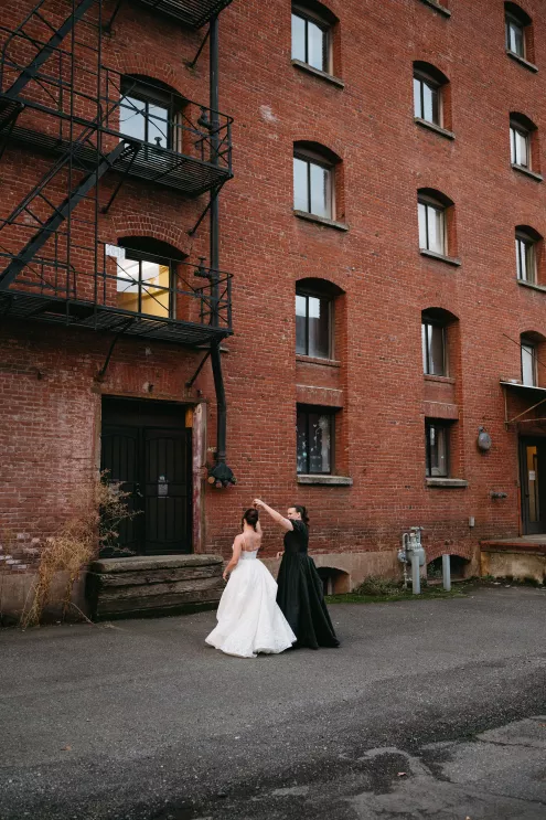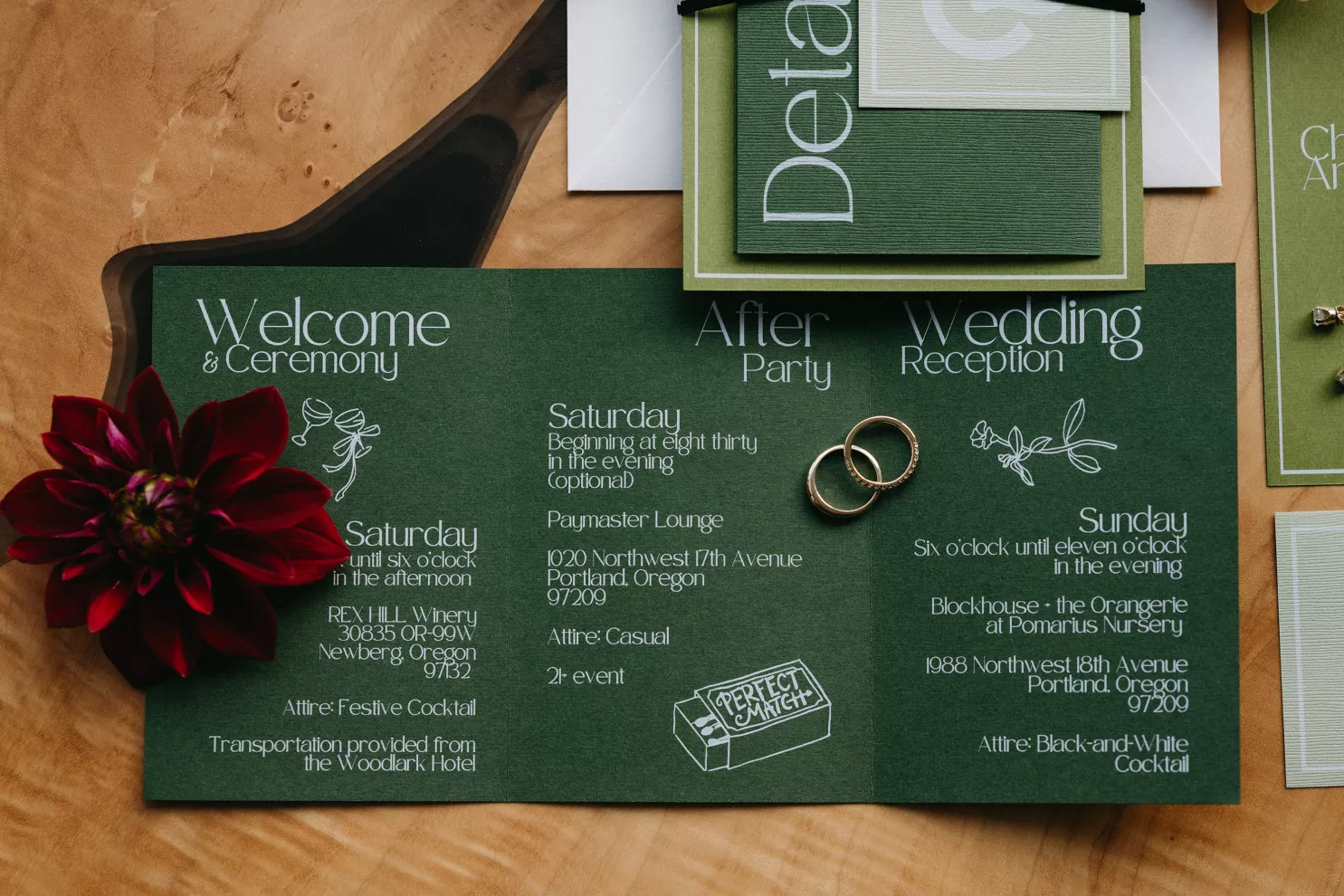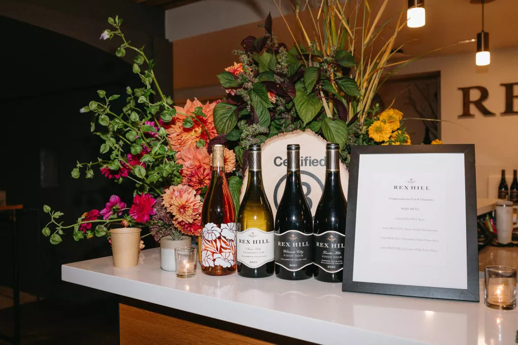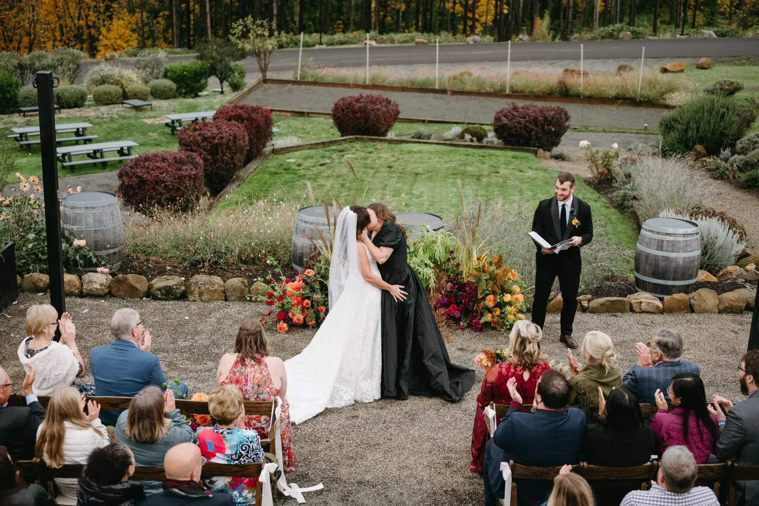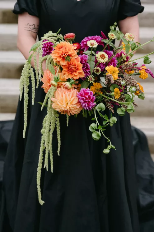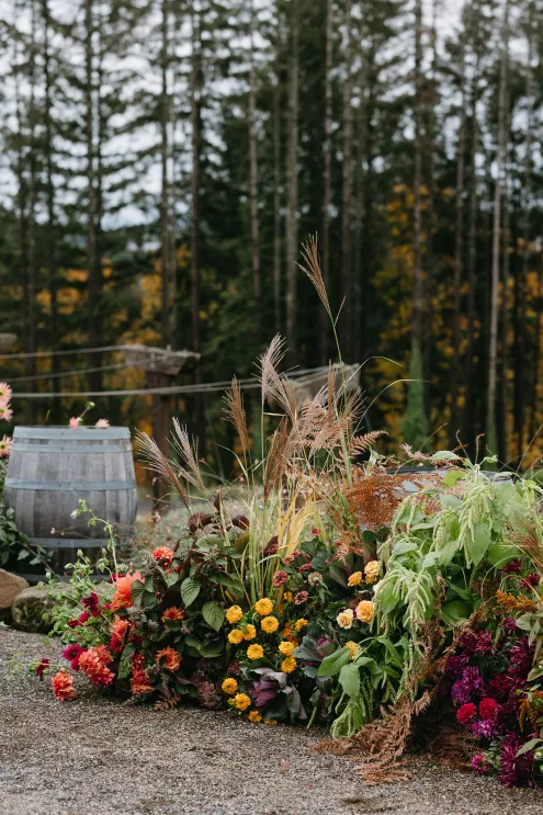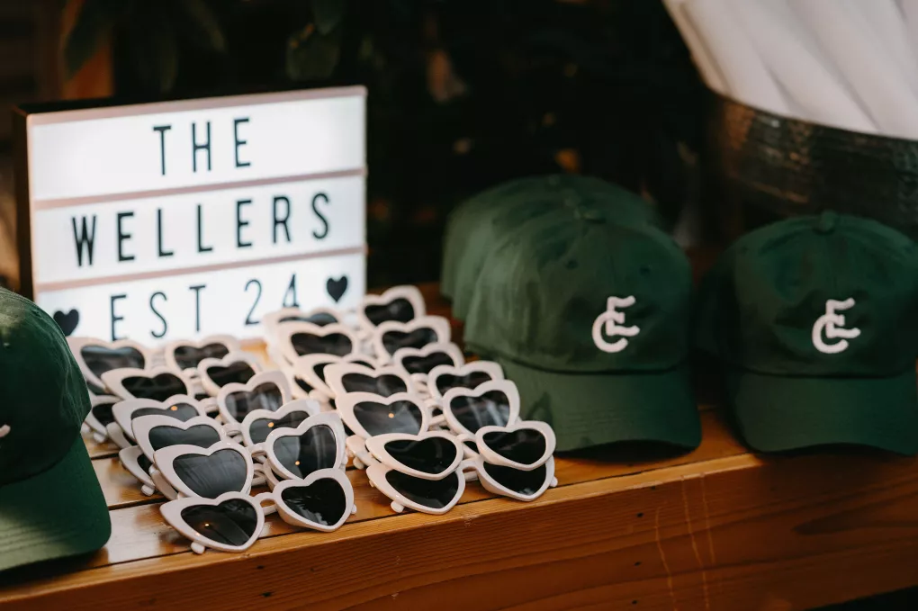 Erin Anderson and Charlotte Weller’s wedding weekend perfectly reflected the duality of the couple’s interests with a warm, intimate ceremony followed by a lively dinner and dance party. The happy couple wanted to honor both their love for the outdoors and their passion for exploring city life with a two-day excursion, each day inspired by their complementary hobbies. Under an overcast sky, Charlotte and Erin’s vision for a cozy ceremony came to life on the verdant grounds of Rex Hill Winery. Erin and Charlotte opted for unique textures and color combinations when it came to their floral arrangements. Romantic blooming dahlias, roses and zinnias were paired with playful ornamental kale, amaranth and smoke bush in color-blocked hues of burgundy, bright pink and creamsicle orange. Charlotte’s black satin puff-sleeved gown contrasted beautifully against Erin’s whimsical floral lace, a visual representation of their dynamic personalities. Their tear-jerking ceremony, framed by moody florals, was followed by a simple cocktail hour, during which guests reveled in the newlyweds’ love. The following day, elegant signage stated, “Join us at the Love Club,” inviting Charlotte and Erin’s loved ones for an evening of dinner, drinks and dancing. Soft shades of sage served as an accent, gracing the tablescape and custom matchboxes. Embroidered hats, heart-shaped sunnies and light-up foam sticks were offered as accessories for the dance floor. After a lively dinner and dancing, Erin and Charlotte gifted their guests with custom cookies showcasing their beloved pet as a sweet ending to their day.