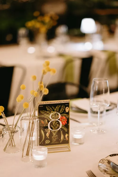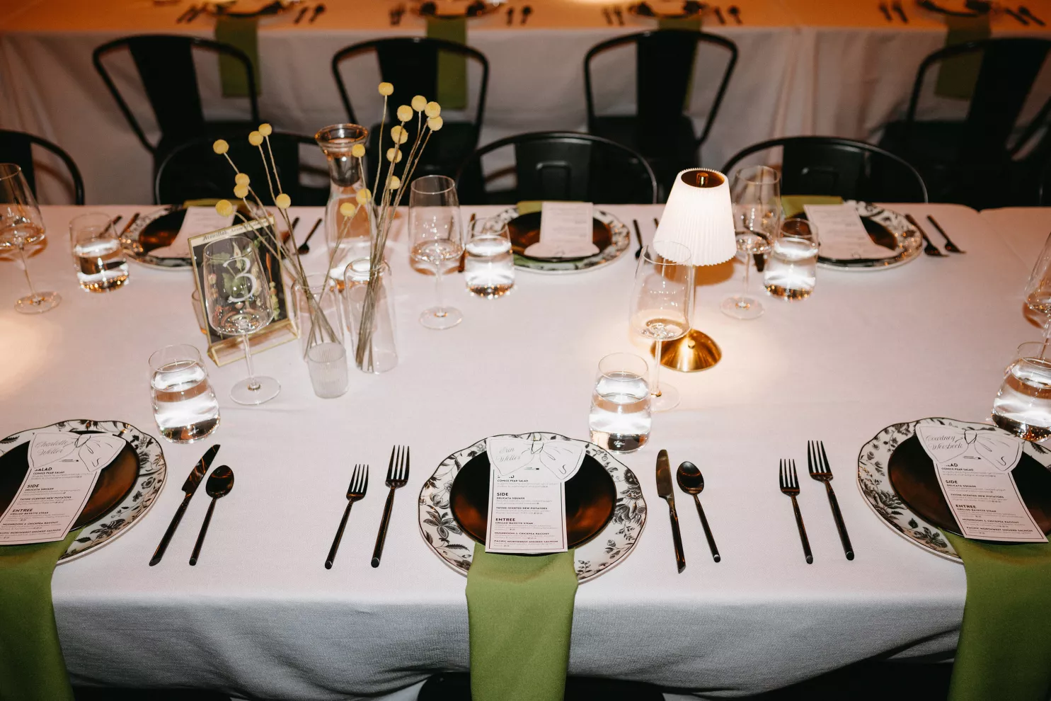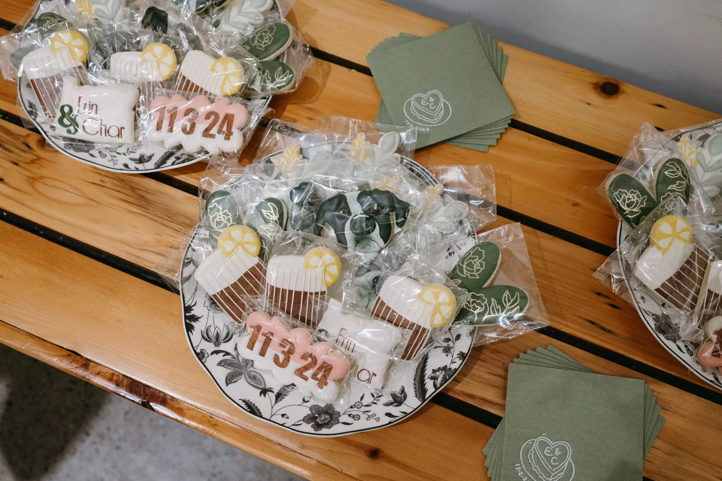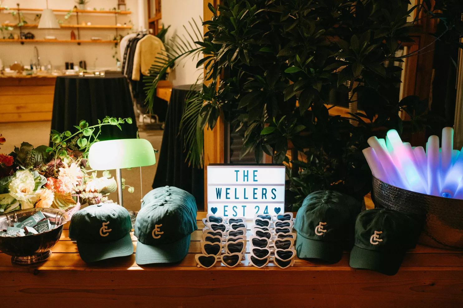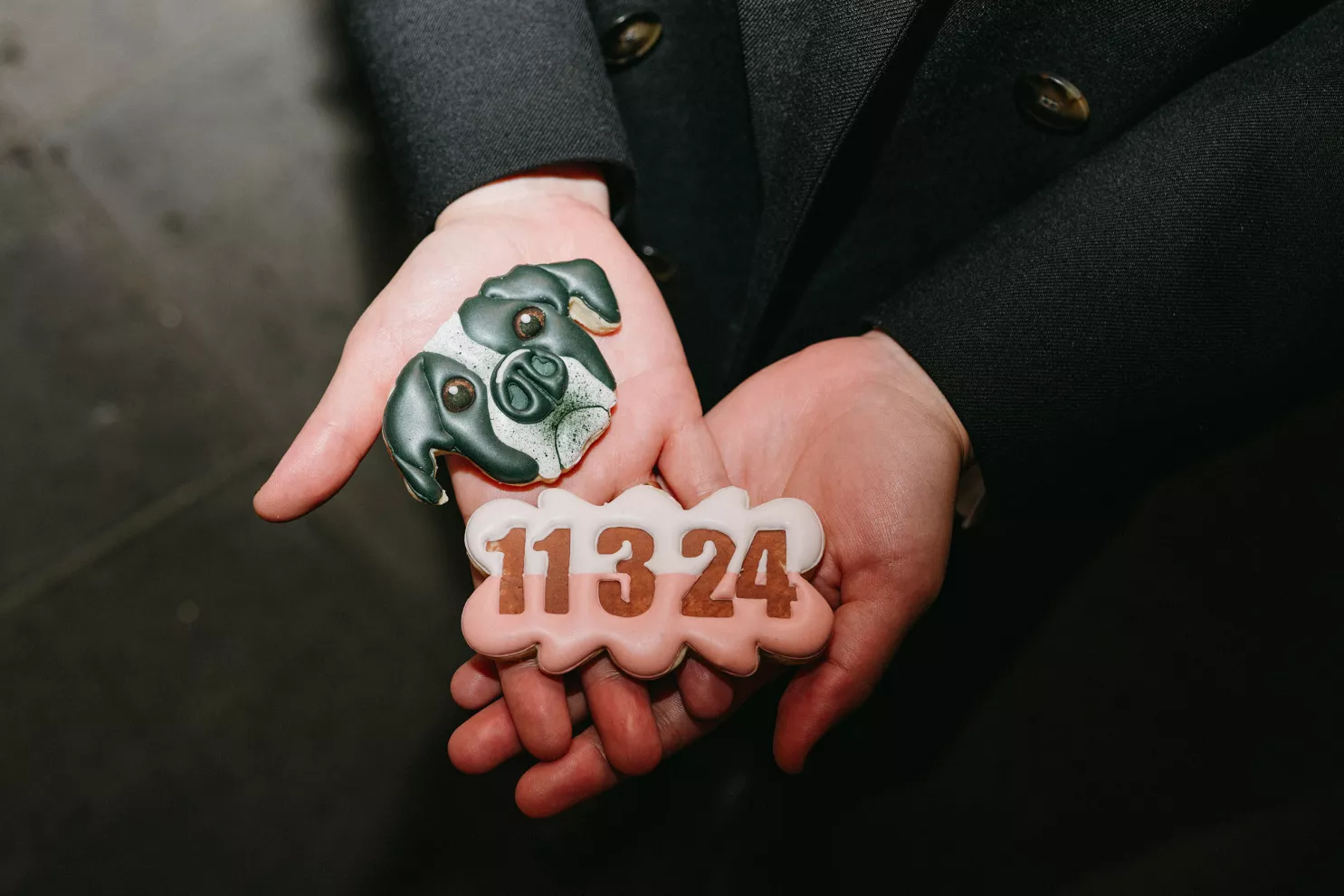 Erin Anderson and Charlotte Weller’s wedding weekend perfectly reflected the duality of the couple’s interests with a warm, intimate ceremony followed by a lively dinner and dance party. The happy couple wanted to honor both their love for the outdoors and their passion for exploring city life with a two-day excursion, each day inspired by their complementary hobbies. Under an overcast sky, Charlotte and Erin’s vision for a cozy ceremony came to life on the verdant grounds of Rex Hill Winery. Erin and Charlotte opted for unique textures and color combinations when it came to their floral arrangements. Romantic blooming dahlias, roses and zinnias were paired with playful ornamental kale, amaranth and smoke bush in color-blocked hues of burgundy, bright pink and creamsicle orange. Charlotte’s black satin puff-sleeved gown contrasted beautifully against Erin’s whimsical floral lace, a visual representation of their dynamic personalities. Their tear-jerking ceremony, framed by moody florals, was followed by a simple cocktail hour, during which guests reveled in the newlyweds’ love. The following day, elegant signage stated, “Join us at the Love Club,” inviting Charlotte and Erin’s loved ones for an evening of dinner, drinks and dancing. Soft shades of sage served as an accent, gracing the tablescape and custom matchboxes. Embroidered hats, heart-shaped sunnies and light-up foam sticks were offered as accessories for the dance floor. After a lively dinner and dancing, Erin and Charlotte gifted their guests with custom cookies showcasing their beloved pet as a sweet ending to their day.