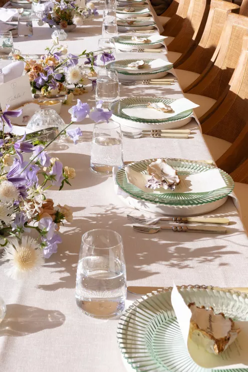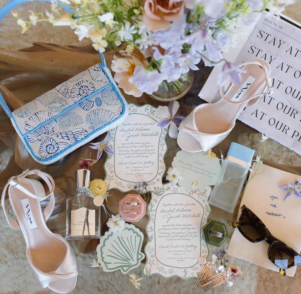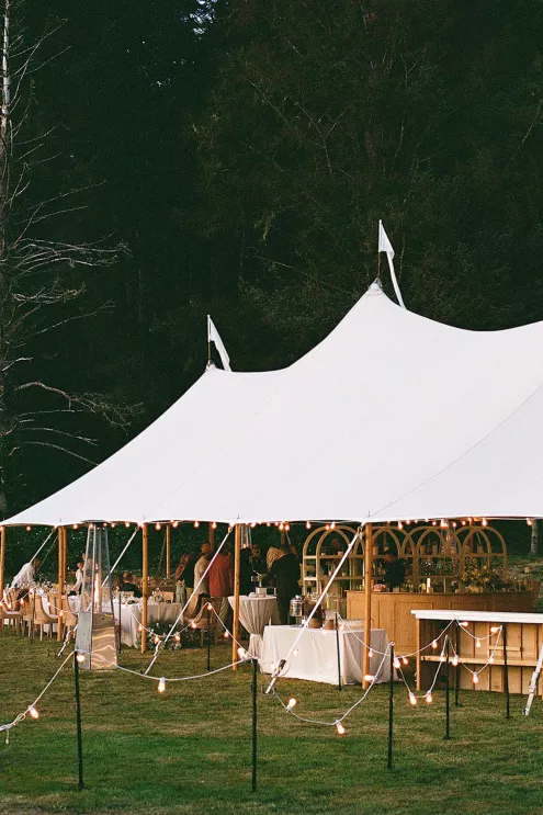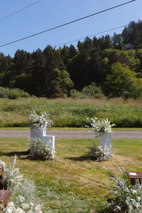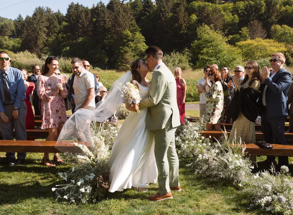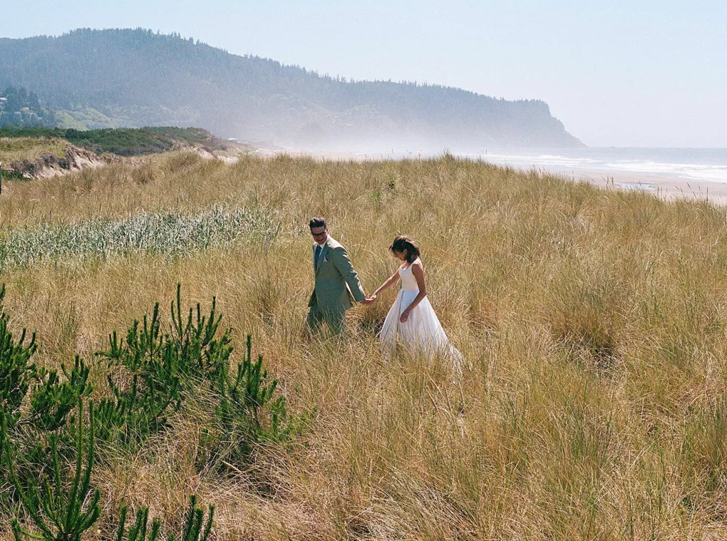 After more than 10 years together, Rachel and Jacob celebrated their love with an intimate wedding at Hawk Creek Gallery. Playful stationery featuring illustrations of seashells, sardines, starfish and oysters set the tone for a fête that embraced the charming aesthetics of coastal Oregon. Starting the day with bubbles by the beach, the couple readied themselves at a nearby oceanfront getaway home with the help of their closest friends and family. Jacob’s sage-green three-piece suit was a stylish extension of the wedding’s colors, while Rachel’s simple, square-neck gown exuded classic elegance. Airy blooms lining the aisle of their outdoor ceremony burst forth from the ground, while a swirling breeze created a romantic scene—Rachel’s veil billowed in the wind as the pair sealed their vows with their first kiss as husband and wife. During the tented reception, more flowers—in stunning shades of butter yellow and lilac—were perched atop the tables and bar. Gold-rimmed pearlescent oyster shells served as place cards, set against delicate seafoam-green-tinted glass charger plates. In the center of it all, and lit by twinkling string lights, a checkerboard dance floor was prepped for plenty of evening revelry. For a sweet finish: cannolis and slices of lovingly handmade, berry-topped cake