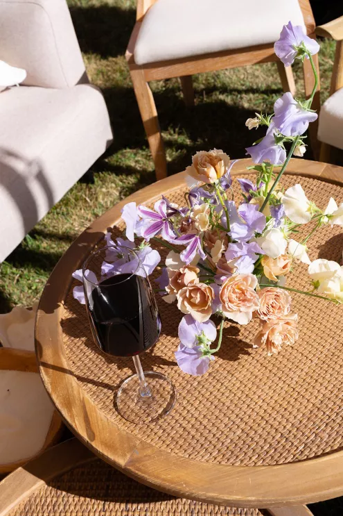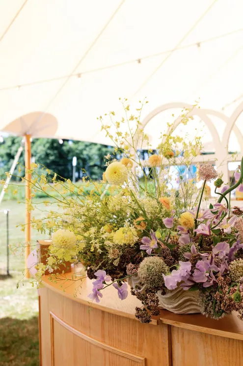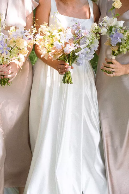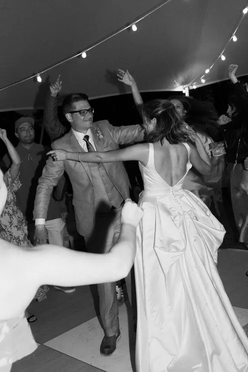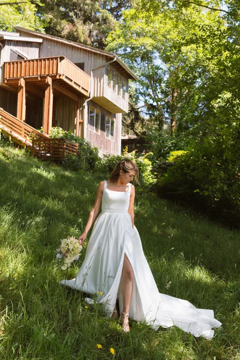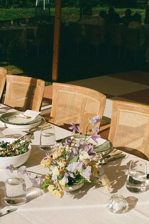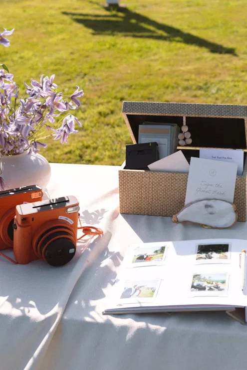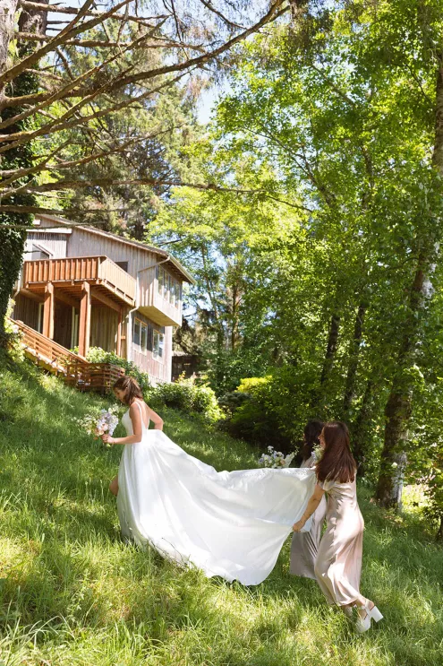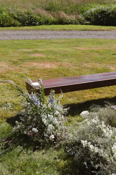 After more than 10 years together, Rachel and Jacob celebrated their love with an intimate wedding at Hawk Creek Gallery. Playful stationery featuring illustrations of seashells, sardines, starfish and oysters set the tone for a fête that embraced the charming aesthetics of coastal Oregon. Starting the day with bubbles by the beach, the couple readied themselves at a nearby oceanfront getaway home with the help of their closest friends and family. Jacob’s sage-green three-piece suit was a stylish extension of the wedding’s colors, while Rachel’s simple, square-neck gown exuded classic elegance. Airy blooms lining the aisle of their outdoor ceremony burst forth from the ground, while a swirling breeze created a romantic scene—Rachel’s veil billowed in the wind as the pair sealed their vows with their first kiss as husband and wife. During the tented reception, more flowers—in stunning shades of butter yellow and lilac—were perched atop the tables and bar. Gold-rimmed pearlescent oyster shells served as place cards, set against delicate seafoam-green-tinted glass charger plates. In the center of it all, and lit by twinkling string lights, a checkerboard dance floor was prepped for plenty of evening revelry. For a sweet finish: cannolis and slices of lovingly handmade, berry-topped cake