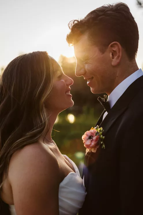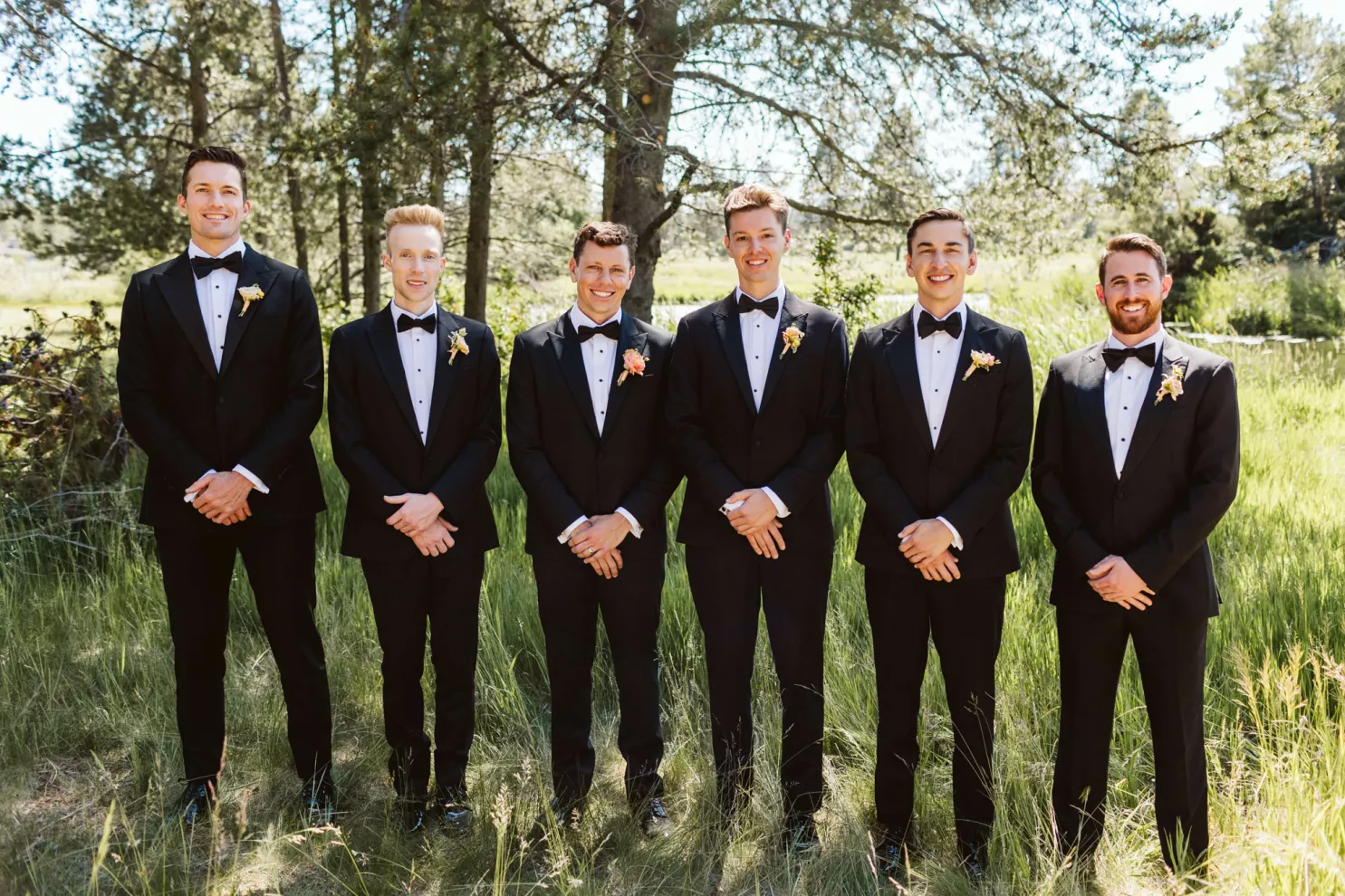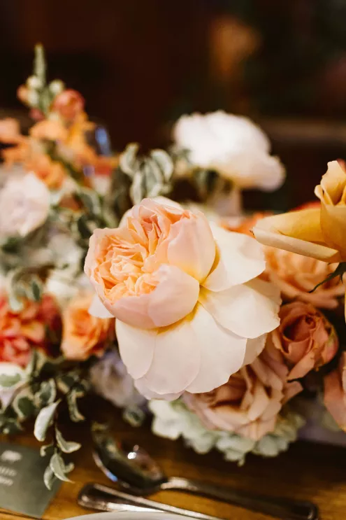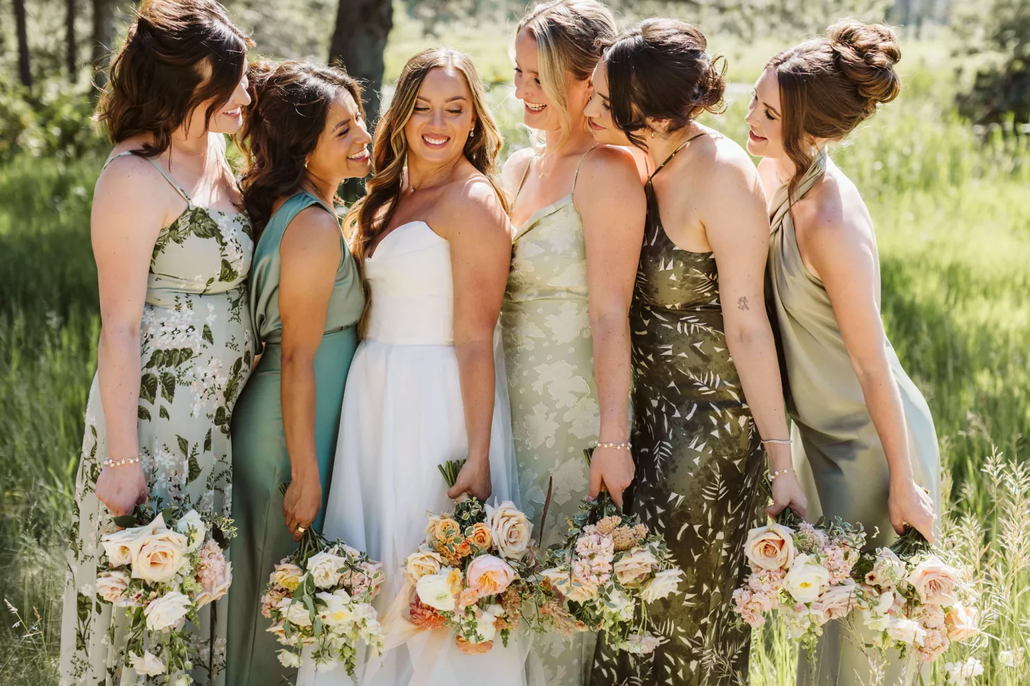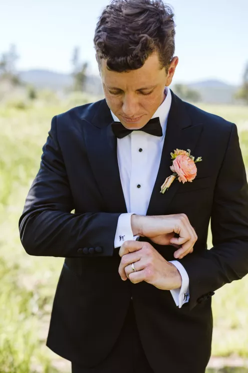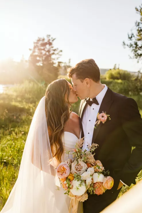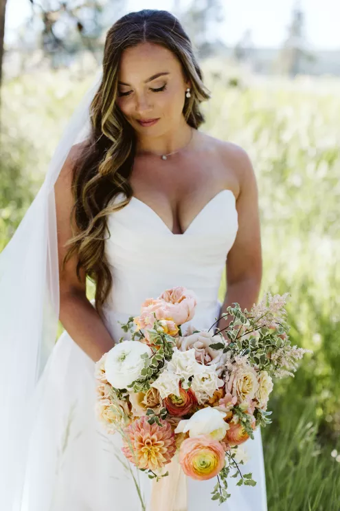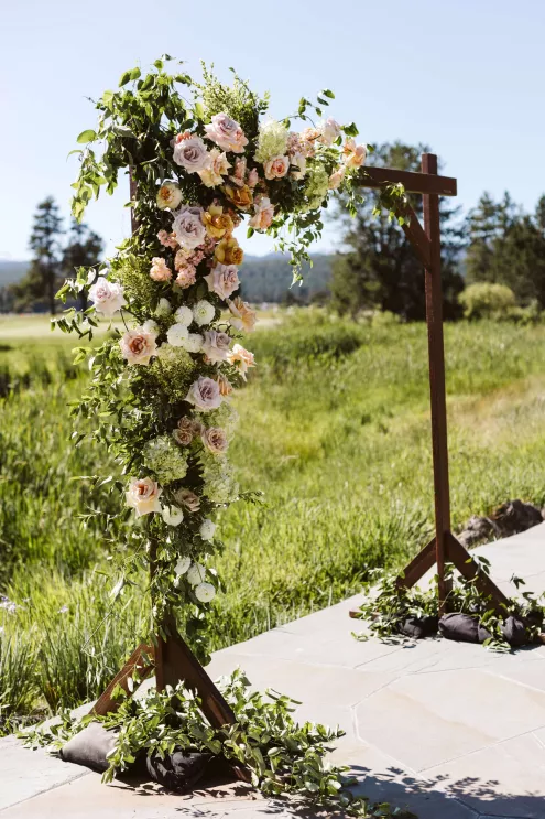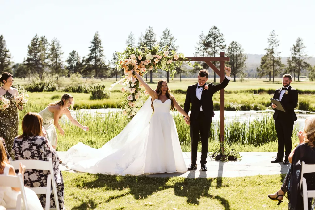 High in the pines of Sunriver, Shannon and Jeffrey’s alfresco celebration kicked off an Oregon summer in unforgettable style. The couple envisioned a day that felt warm and truly alive—where rustic log cabin charm met the vibrance of seasonal blooms. Guests arrived to the scent of pine and the sound of a babbling brook that played backdrop to the lush floral arbor framing the altar. Bursts of pinks, peaches and creams danced in the sunlight, while soft petals were scattered down the aisle and the surrounding woods, and brush and reeds lent their shades of green to the “I do’s.” Cocktail hour spilled effortlessly from lawn to lodge, creating a natural transition from the vast outdoors to the cozy interior. Attendees mingled around Ikebana-style floral arrangements, chatting and sipping in a space illuminated by streaming sunlight, café lights and flickering candles. Come golden hour, the reception came alive in color and texture—mantel florals stretched above the grand fireplace, greenery curled around wooden beams and tables were dressed in a modern mix of low and linear blooms. Each vignette felt intentional yet entirely wild, echoing the newlyweds’ playful-meets-refined spirit. When Shannon and Jeffrey took the floor for their first dance, they held the attention of their nearest and dearest with the precision of professionals. Their choreographed routine was graceful and full of joy—a reflection of the love and energy that defined their day.