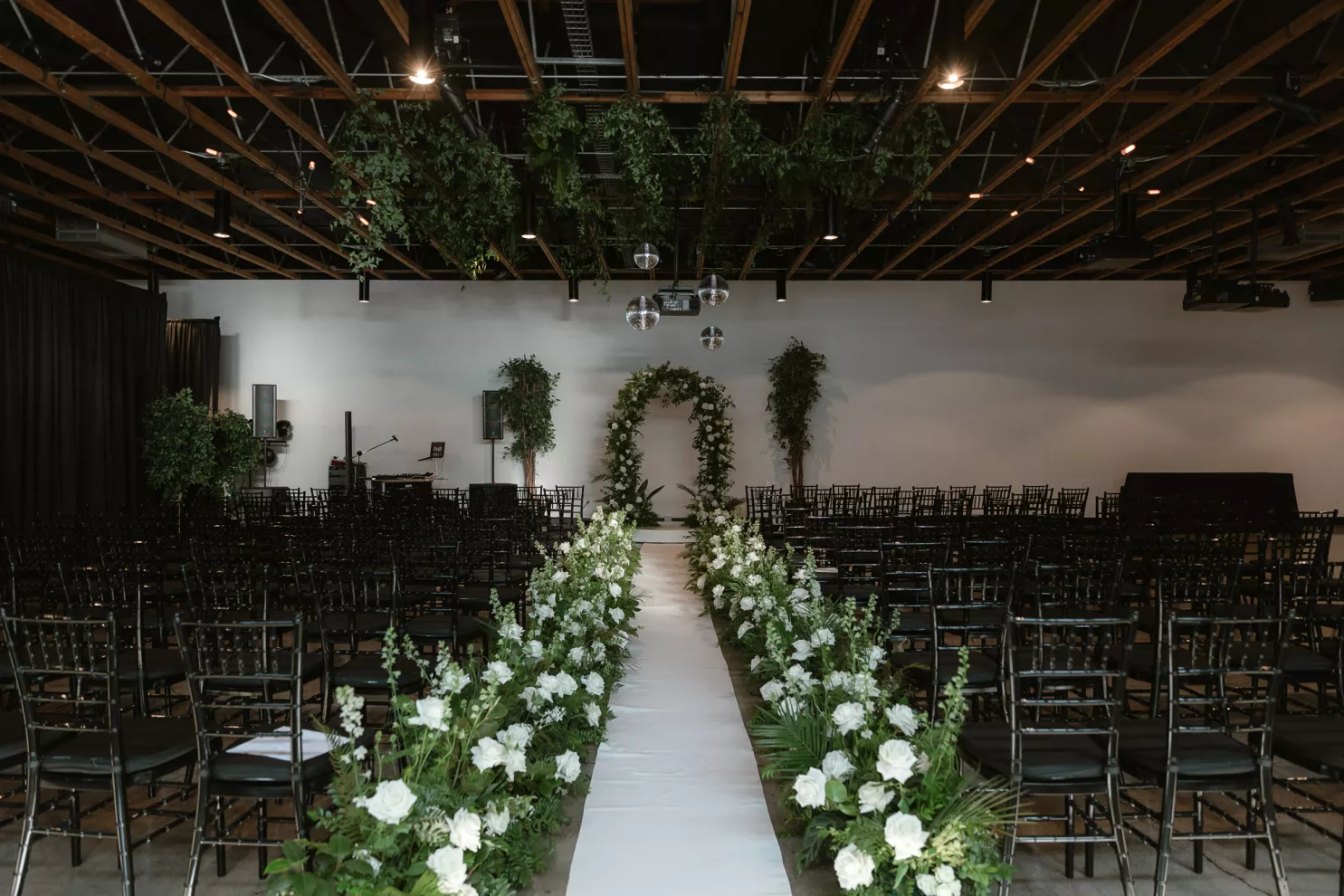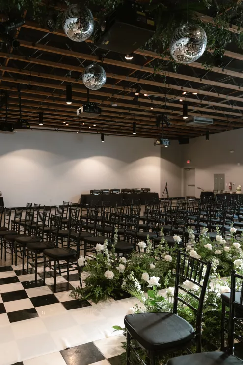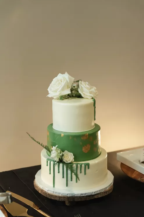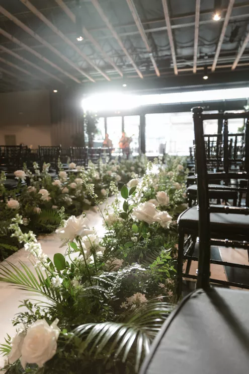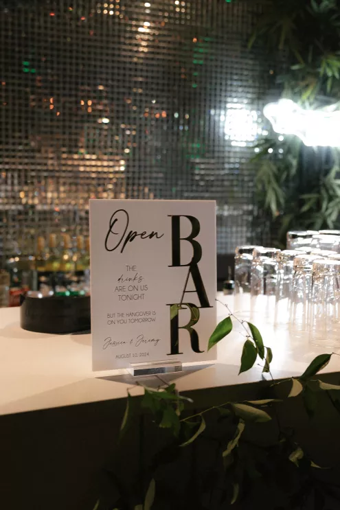 The following day, a sophisticated palette of black, sage green, forest green, gold, champagne and stone created a garden oasis in the middle of the city. The enchanting décor included ferns, towering bamboo and Ficus trees, disco balls and lounge seating. Guests were encouraged to walk around and try different types of foods that represented the places Jessica and Jeremy had travelled to at different staffed buffet stations, providing a unique and playful dinner experience. Their evening of revelry had everyone dancing into early hours of the next day which was celebrated with a special cake and toast to the bride on her birthday.