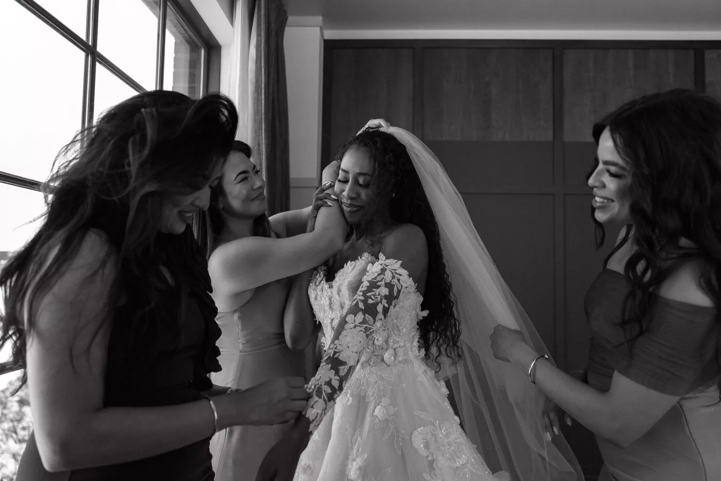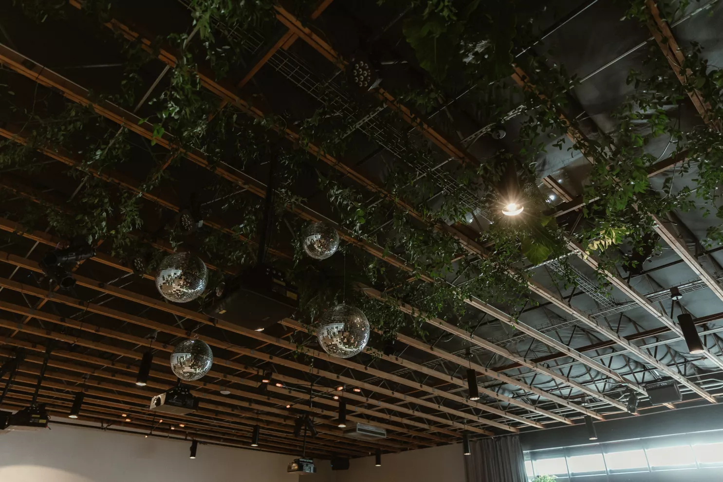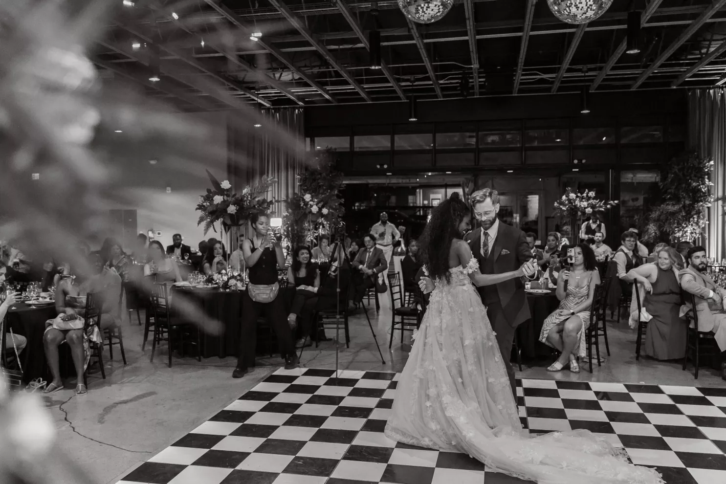 The following day, a sophisticated palette of black, sage green, forest green, gold, champagne and stone created a garden oasis in the middle of the city. The enchanting décor included ferns, towering bamboo and Ficus trees, disco balls and lounge seating. Guests were encouraged to walk around and try different types of foods that represented the places Jessica and Jeremy had travelled to at different staffed buffet stations, providing a unique and playful dinner experience. Their evening of revelry had everyone dancing into early hours of the next day which was celebrated with a special cake and toast to the bride on her birthday.